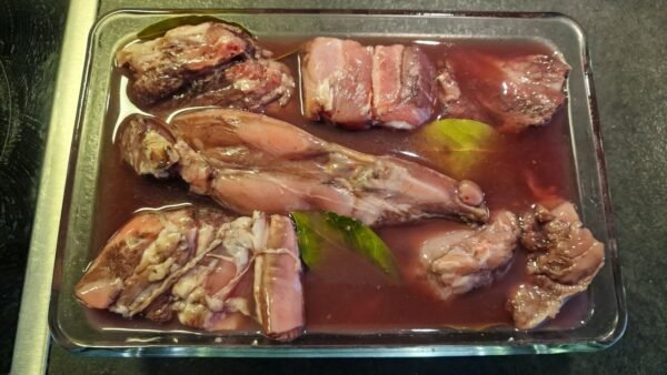 - Place the rabbit pieces, garlic, and bay leaves in a bowl. Pour in the wine. Let it marinate in the fridge overnight—or even for a full 24 hours.