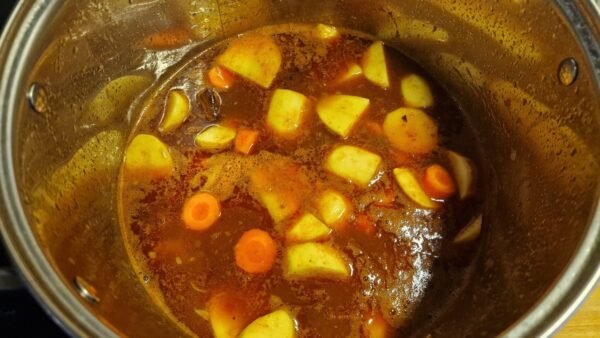 - Add the potatoes and carrots to the pot, making sure the sauce covers everything. Bring back to a boil, then simmer covered on low heat for another 40 minutes.